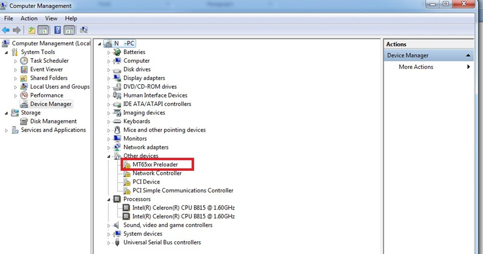 1st step: Power Off the phone and Connect your phone with PC via USB cable. Now go to My Computer>Manage> Other devices> MT65xx Preloader